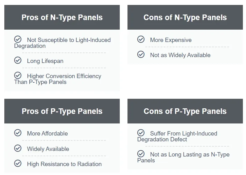 พลังงานแสงอาทิตย์กำลังกลายเป็นวิธีที่นิยมมากขึ้นในการช่วยลดค่าไฟและสร้างบ้านที่สามารถพึ่งพาตนเองได้มากขึ้นสำหรับเจ้าของบ้าน เมื่อคุณเริ่มตรวจสอบระบบพลังงานแสงอาทิตย์เป็นครั้งแรก คุณจะสังเกตเห็นว่าแผงโซลาร์เซลล์มีจำหน่ายสองประเภท ซึ่งรวมถึงแผงชนิด n และแผงชนิด p การรู้ความแตกต่างระหว่างทั้งสองจะช่วยให้คุณตัดสินใจได้ดีที่สุดว่าอันไหนที่เหมาะกับความต้องการและงบประมาณเฉพาะของคุณ วัสดุและโครงสร้างของเซลล์แสงอาทิตย์ การสร้างเซลล์แสงอาทิตย์โดยเฉพาะจะแตกต่างกันเล็กน้อยขึ้นอยู่กับเทคโนโลยีเฉพาะที่ใช้ในการผลิต ในเซลล์แสงอาทิตย์ส่วนใหญ่ จะมีสนามพื้นผิวด้านหลังเป็นอะลูมิเนียมและจุดเชื่อมต่อ P-N ที่ทางแยก P-N มีเวเฟอร์ซิลิคอนผลึกชนิด p ที่มีประจุบวก และเวเฟอร์ซิลิคอนผลึกชนิด n ที่มีประจุลบ ความแตกต่างที่ใหญ่ที่สุดประการหนึ่งระหว่างเซลล์แสงอาทิตย์ชนิด n และชนิด p คือชนิดของเวเฟอร์ผลึกซิลิคอน (c-Si) ที่ประกอบขึ้นเป็นบริเวณที่เป็นกลุ่ม และชนิดใดที่ประกอบเป็นบริเวณตัวปล่อยที่บางกว่า เวเฟอร์ทั้งสองนี้ทำงานร่วมกันเพื่อสร้างสนามไฟฟ้าภายในเซลล์แสงอาทิตย์เพื่อผลิตพลังงาน แผงโซลาร์เซลล์ชนิด N คืออะไร? ด้วยแผงโซลาร์เซลล์ชนิด n พื้นที่ ของ ซิลิคอน c-si จำนวนมากจะมีประจุลบ เนื่องจากแผ่นเวเฟอร์เจือด้วยฟอสฟอรัส ชั้นตัวปล่อยชั้นบนสุดมีประจุลบเนื่องจากการเจือด้วยโบรอน แผงโซลาร์เซลล์ชนิด N เริ่มได้รับความนิยมมากขึ้นเนื่องจากมีข้อได้เปรียบที่สำคัญคือไม่ไวต่อการเสื่อมสภาพจากแสง เนื่องจากแผงโซลาร์เซลล์ชนิด P ถูกค้นพบแล้ว แผงโซลาร์เซลล์ชนิด N เหล่านี้สามารถใช้งานได้กับงานก่อสร้างทุกประเภทและมีอายุการใช้งานยาวนานกว่า อย่างไรก็ตาม มีราคาสูงกว่าแผงชนิด P แบบดั้งเดิม